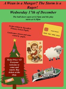 Scripts have been sent home- please help your young person learn their lines for the upcoming play. We are aiming to be script-less by next Friday. As stated in the school calendar the school play is Wednesday 17th of December at 6.15pm for 6.30pm start at Tayvallich Village Hall.